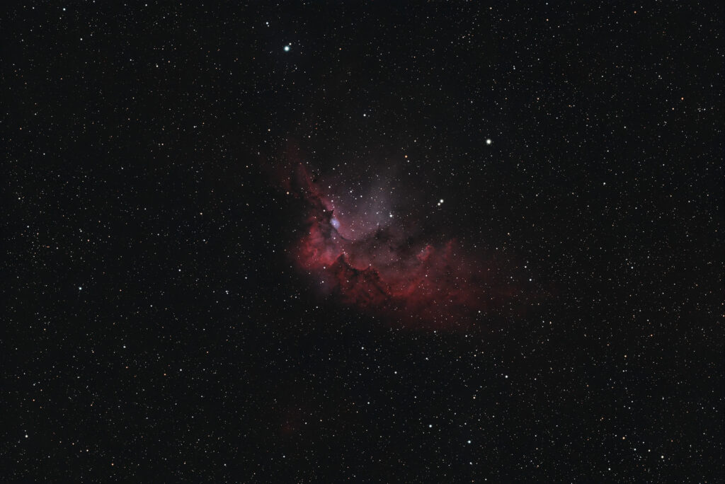 This image was captured using my William Optics FLT132 refractor paired with a ZWO ASI2600MC camera. The FLT132’s 132mm aperture and 925mm focal length provide an excellent balance of field of view and resolution for nebulae of this size. The ASI2600MC’s back-illuminated sensor and 26-megapixel resolution allow for detailed captures even in our challenging Highland weather conditions.